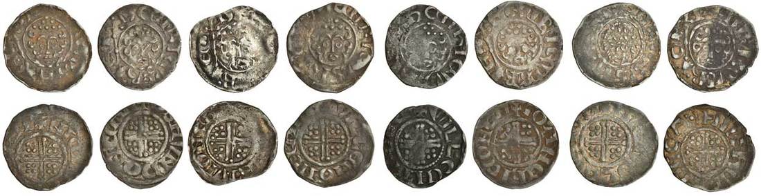 Henry III (1216-1272), ‘Short Cross’ Coinage, Pennies (8), Canterbury, Class 7c(A) (5), Nichole, 1.43g, rev. +nich[ ]an, almost fine, Osmvnd, 1.40g, rev. +oshvndoncant, fine, Robert Vi, 1.37g, rev. [ ]ert•vionca, partly flat, otherwise fine, Willem, 1.46g, rev. +willemonant, toned, fine, Willem Ta, 1.35g, rev. +willemtaon[ ], partly flat, near fine, Class 7c(B) (2), Ioan Chic, 1.51g, rev. +ioanchiconca, fine, Nichole (2), 1.45g, rev. +nicholeonca, fine, 1.41g, Class 7c(B)/7c(C) mule, +nicholeonca•, mottled tone, fine (N.980; S.1356C; Stewartby VIIc1, VIIc2, VIIc2/3), the third extremely rare (8)