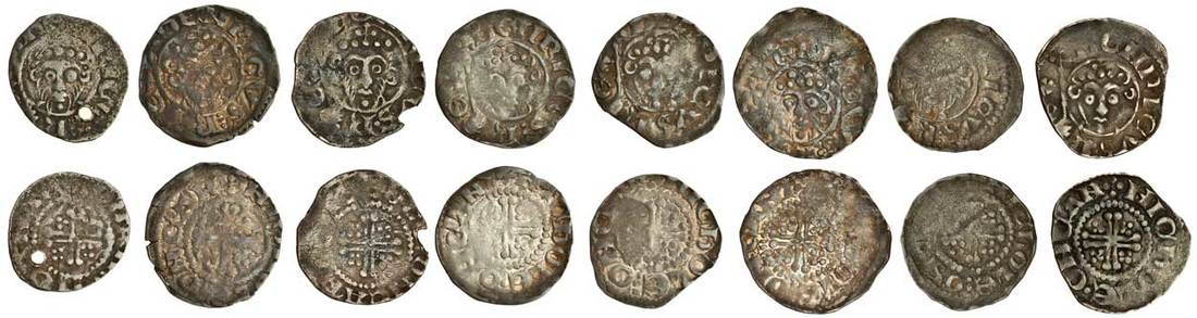 Henry III (1216-1272), ‘Short Cross’ Coinage, Pennies (8), Canterbury, Class 8bí2, Iohan, 1.06g, +iohan•oncante, clipped and pierced,the portrait good fine, Nichole (7), 1.37g, +nicholeoncan, edge splits, toned, near fine, 1.39g, [ ]oncan[ ], irregular and chipped, otherwise fine, 1.40g, +nichole•oncant, round, lightly toned, near fine, 1.36g, +nichole•onca, irregular, about fine, 1.36g, [ ]icole•cant, fine, 1.47g, +nichole•on[ ], mostly flat, fair, 1.47g, +nichole•oncan, a decent portrait, peripheral weakness, nearly very fine (N.981/2; S.1357B; Stewartby VIIIb), the first moneyer is very rare (8)