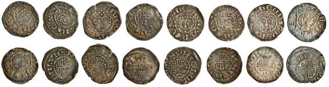 Henry III (1216-1272), ‘Short Cross’ Coinage, Pennies (8), London, Class 8bí2, Nichole (8), 1.36g, +nicholeonlvn, struck off-centre, toned, near fine, the reverse better, 1.39g, +nic[ ]•onlvn, struck off-centre with marks, near fine, 1.40g +nichole•onlvn, striking splits, toned, fine, 1.32g, +nic[ ]lvn, struck off-centre, toned, fine, 1.43g, +nichole[ ]nlvn, toned, good fine, 1.37g, +nichol[ ]lvn, the reverse struck off-centre, fair, 1.41g, +nichole:onlvn, good fine, 1.48g, +nicho[ ]lvn,the legends mostly flat, otherwise very fine (N.981/2; S.1357B; Stewartby VIIIb), (8)