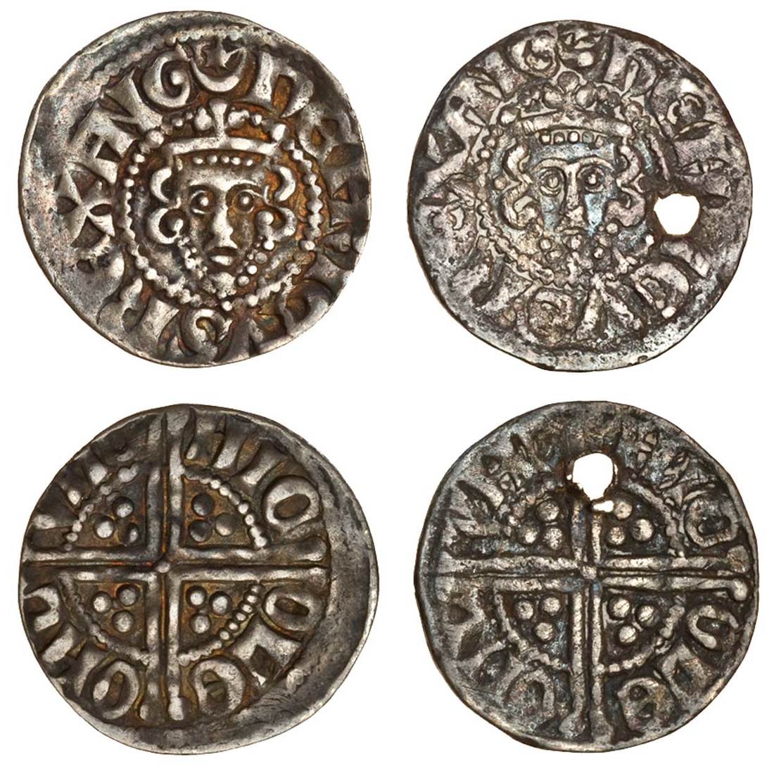 Henry III (1216-1272), ‘Long Cross’ Coinage, Pennies (2), London, Phase 1, Class 1b/2a mule, Nicole, 1.45g, obv. i.m.1, hehricvs rex ang, five dots below crown, rev. hic ole ohl vhd, three pellets around a central point in each angle, struck slightly off-centre, almost very fine, 1.24g, rev. three pellets in each angle, no central point, nearly very fine (N.984/N.985/1; S.1360; Stewartby Ib/IIa), the second pierced, both rare (2)