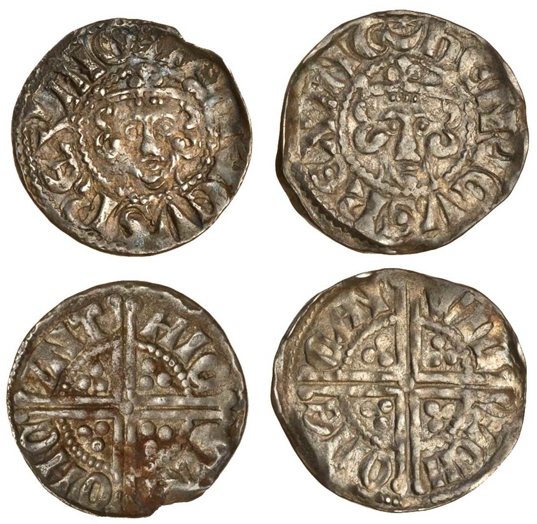 Henry III (1216-1272), ‘Long Cross’ Coinage, Pennies (2), Canterbury, Phase 1, Class 1b/2a mule, Nicole, 1.25g, obv. i.m.1, henricvs rex ang, rev. hic ol[ ] ohc ant, double struck obverse, slight edge damage at 1 o’clock, otherwise nearly very fine, Willem, 1.38g, rev. wil lem ohe can, very fine (N.984/N.985/1; S.1360; Stewartby Ib/IIa, the second pl.3/53 this coin), both rare (2)