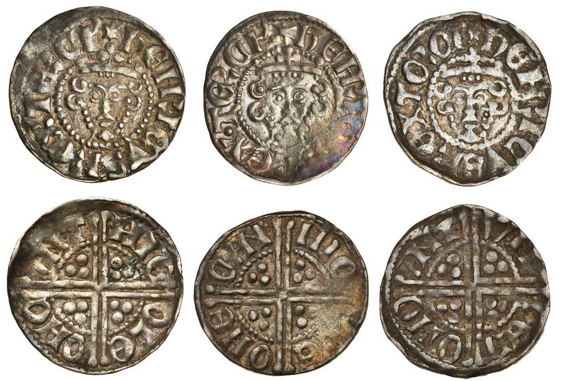 Henry III (1216-1272), ‘Long Cross’ Coinage, Pennies (3), Canterbury, Phase 1, Class 2a, Nicole (2), 1.50g, obv. i.m.2, hehricvs rex terci’, facing bust as class 1, rev. hic ole ohc ant, almost very fine, 1.51g, obv. stop after rex, rev. hic ole ohe can, slight weakness in the legends at one point, otherwise very fine, Willem, 1.43g, rev. wil lem ohc ant, nearly very fine (N.985/1; S.1361; Stewartby IIa), the first and third with three pellets below the crown, the second with five (3)