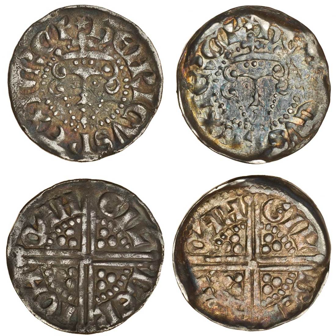 Henry III (1216-1272), ‘Long Cross’ Coinage, Pennies (2), Canterbury, Phase 2, Class 2bí2, Gilbert (2), 1.39g, rev. gil ber toh cah, toned, a crack at 3 o’clock, good fine, 1.42g, attractive multi-coloured hues, very fine (N.985/2; S.1361A; Stewartby IIb2), (2)