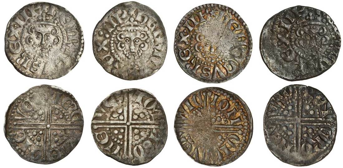 Henry III (1216-1272), ‘Long Cross’ Coinage, Pennies (4), York, Phase 2, Class 3aí1, Ieremie, 1.49g, rev. iere mie one ver, almost very fine, Class 3aí2, Tomas, 1.42g, obv. i.m 3*, colon after rex, toned, almost very fine, Class 3abí1 (2), Ion, 1.44g, rev. ion one ver wic, atractively toned but flat in parts, otherwise nearly very fine, Rener, 1.28g, ren ero nev erw struck off-centre, porous, dark tone, fine (N.986, N.986/1; S.1362, S.1362A, S.1362B; Stewartby IIIa1, IIIa2, IIIab1), (4)