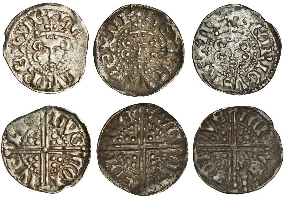 Henry III (1216-1272), ‘Long Cross’ Coinage, Pennies (3), Ilchester, Phase 2, Class 3abí1, Hvge, 1.38g, rev. hvg eon ive lce, irregular and weak at this point, very fine, Class 3abí2, Randvlf, 1.31g, ornate X, rev. ran dvl foh ive, cracked, fine, Class 3b, Iervais, 1.22g, rev. ier vai son ive, small edge crack, dark tone, almost very fine (N.986/1, N.987; S.1362B, S.1363; Stewartby IIIab1, IIIab2, IIIb), a rare mint (3)