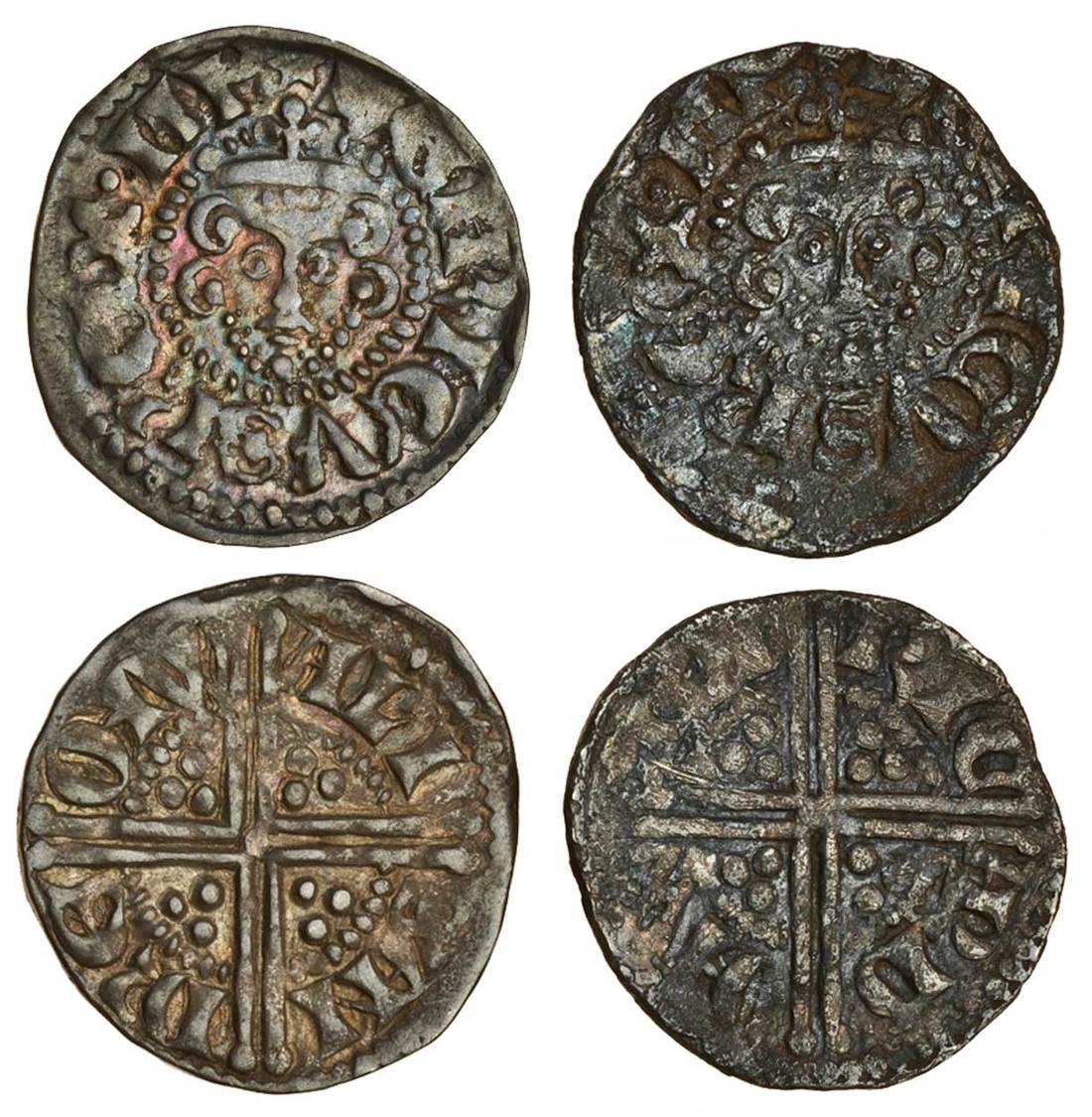 Henry III (1216-1272), ‘Long Cross’ Coinage, Pennies (2), Wallingford, Phase 2, Class 3abí1 (2), Alisandre, 1.48g, rev. ali san dre onw, multi-coloured toning, very fine and most attractive, Ricard, 1.38g, rev. ric ard onw ali, corroded, but decent detail, better than fine (N.986/1; S.1362B; Stewartby IIIab1), both rare (2)