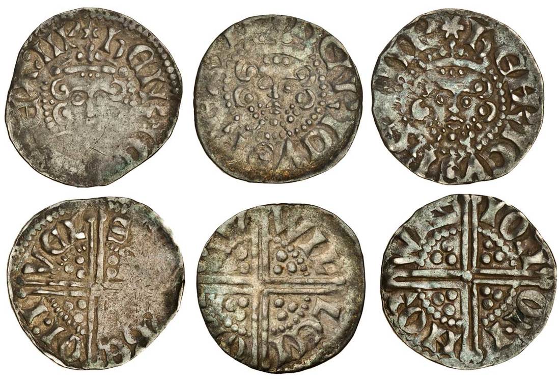 Henry III (1216-1272), ‘Long Cross’ Coinage, Pennies (3), Ilchester, Phase 2, Class 3c, Stephen, 1.47g, rev. s[ ]be on:i vel, the bottom third of the coin flat both sides, the struck up parts almost very fine, Norwich (2), Class 3bc, Willem, 1.41g, wil lem ohn orw, the reverse off-centre, nearly very fine, Class 3c, Ion, 1.34g, ion on nor wiz, toned, very fine (N.987/1, N.988; S.1363A, S.1364; Stewartby IIIc, IIIbc), the first a rare mint and moneyer (3)