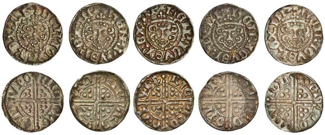 Henry III (1216-1272), ‘Long Cross’ Coinage, Pennies (5), London, Phase 3, 1250-72, Post-Provincial Phase, Class 3dí1 (2), small neat bust with pointed chin and neck lines, Nicole, 1.45g, rev. nic ole onl vnd, toned, very fine, Ricard, 1.48g, rev. ric ard onl vnd, nearly very fine, Class 3dí2 (2), rounder bust, late R, Ricard (2), 1.42g, rev. ric ard onl vnd, the reverse attractively toned, a bold very fine, another, 1.43g, porous surfaces, good fine, Henri, 1.43g, late issue, i.m.5, rev. hen rio nlv nde, nearly very fine (N.988/1; S.1364A, S.1364B; Stewartby IIIc2, IIId,), all scarce, the last very scarce (5)