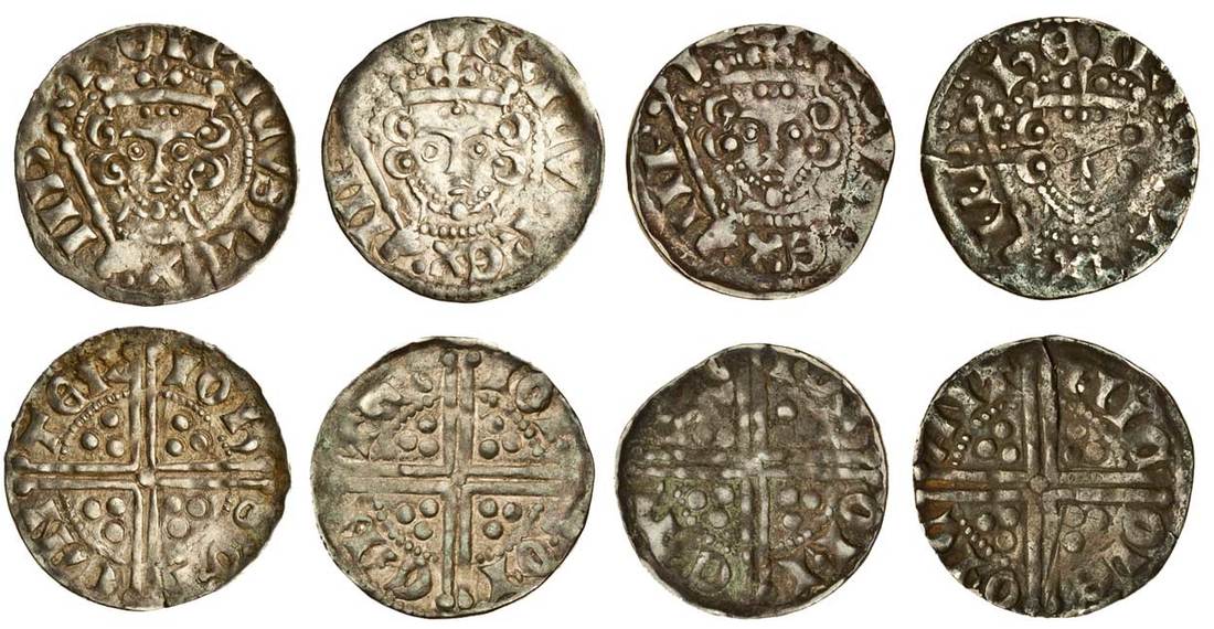 Henry III (1216-1272), ‘Long Cross’ Coinage, Pennies (4), Phase 3, Class 5aí2, Canterbury (4), Ion S (2), 1.48g, rev. ion s•on can ter, toned, very fine, another, 1.41g, a bold very fine, Ion, 1.52g, rev. ion on can ter, dirt in the devices, near very fine, Nicole, 1.21g, rev. nic ole onc ant, cracked with a pair of tiny perforations nearby, fine (N.991/2; S.1367A; Stewartby Va2), (4)