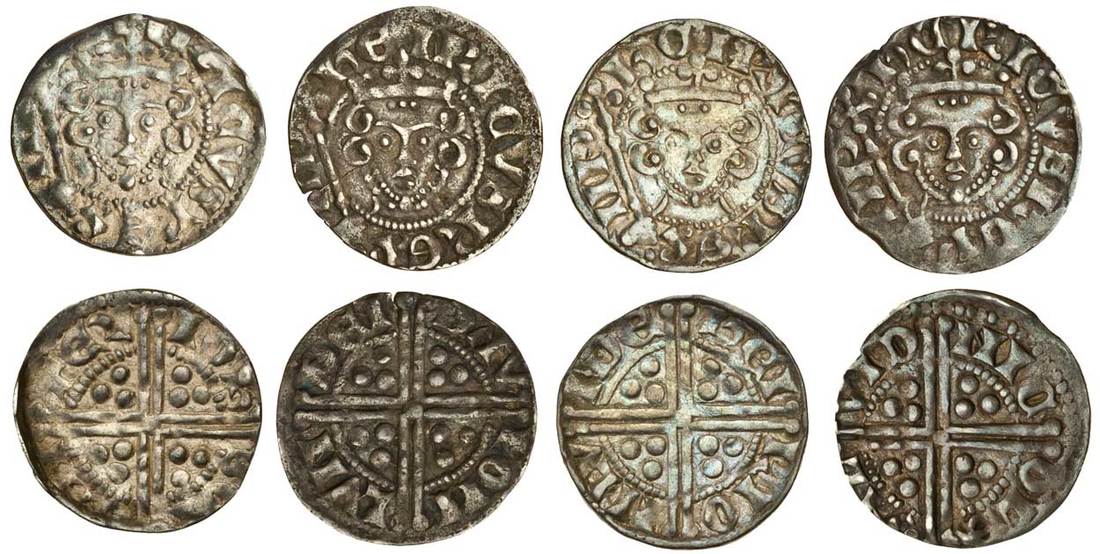 Henry III (1216-1272), ‘Long Cross’ Coinage, Pennies (4), Phase 3, Class 5aí3, ornamental X, Canterbury (1), Ion S, 1.19g, rev. ioh s•on can ter, toned, very fine, London (3), Davi, 1.33g, dav on lvn dei, porous surfaces and a crack, about very fine, Henri, 1.42g, rev. hen rio nlv nde, a scratch to the obverse, attractively toned, good very fine, Nicole, 1.40g, rev. nic ole onl vnd, slight peripheral weakness, otherwise very fine (N.991/3; S.1367A; Stewartby Va3) (4)
