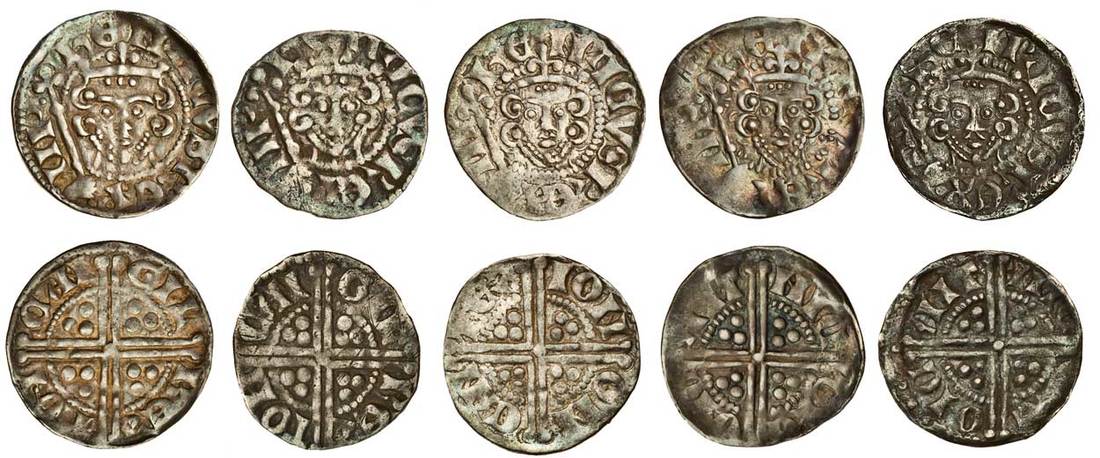 Henry III (1216-1272), ‘Long Cross’ Coinage, Pennies (5), Phase 3, Canterbury, Class 5bí2, crown with pellets at each end and a central fleur of pellets, ornate X, Gilbert (2), rev. gil ber ton can, 1.43g, nearly very fine, 1.24g, slightly small, fine, Ion, 1.43g, rev. ion on can ter, slight weakness at 7 o’clock, very fine, Nicole (2), rev. nic ole onc ant, 1.38g, weak legends with a strong portrait, very fine, 1.34g, the reverse porous, nearly very fine (N.992/2; S.1368A; Stewartby Vb2) (5)
