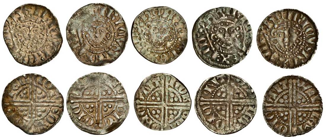 Henry III (1216-1272), ‘Long Cross’ Coinage, Pennies (5), Phase 3, Canterbury, Class 5f, Ion, 1.47g, rev. ioh son can ter, softly struck, near very fine, Nicole, 1.49g, rev. nic onc onc ant, flat in parts, otherwise very fine, Robert, 1.26g, rev. rob ert onc ant, slightly clipped, good fine, the obverse better, Walter, 1.38g, rev. wal ter onc ant, worn, about fine, Willem, 1.40g, rev. wil lem onc ant, a flaw cross the portrait passing light, good fine (N.996; S.1372; Stewartby Vf), the second rare with the legend error (5)