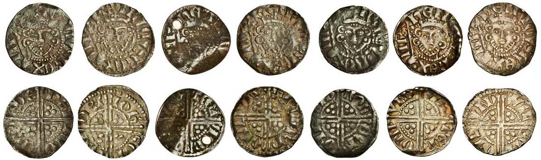 Henry III (1216-1272), ‘Long Cross’ Coinage, Pennies (7), Phase 3, London, Class 5g, Henri, 1.38g, rev. hen rio nlv nde, porous, fine, Ioh’s, 1.47g, rev. ioh’ son lvn den, struck slightly off centre, almost very fine, Renavd, 1.11g, rev. ren avd onl vnd, clipped and pierced, fair, Ricard, 1.35g, rev. ric ard onl vnd, soft in parts, nearly very fine, Robert, 1.28g, rev. rob ert onl vnd, fine, Walter, 1.44g, rev. wal ter onl vnd, toned, nearly very fine, Willem, 1.49g, rev. wil lem onl vnd, about very fine (N.997; S.1373; Stewartby Vg), the second and fifth moneyers rare (7)