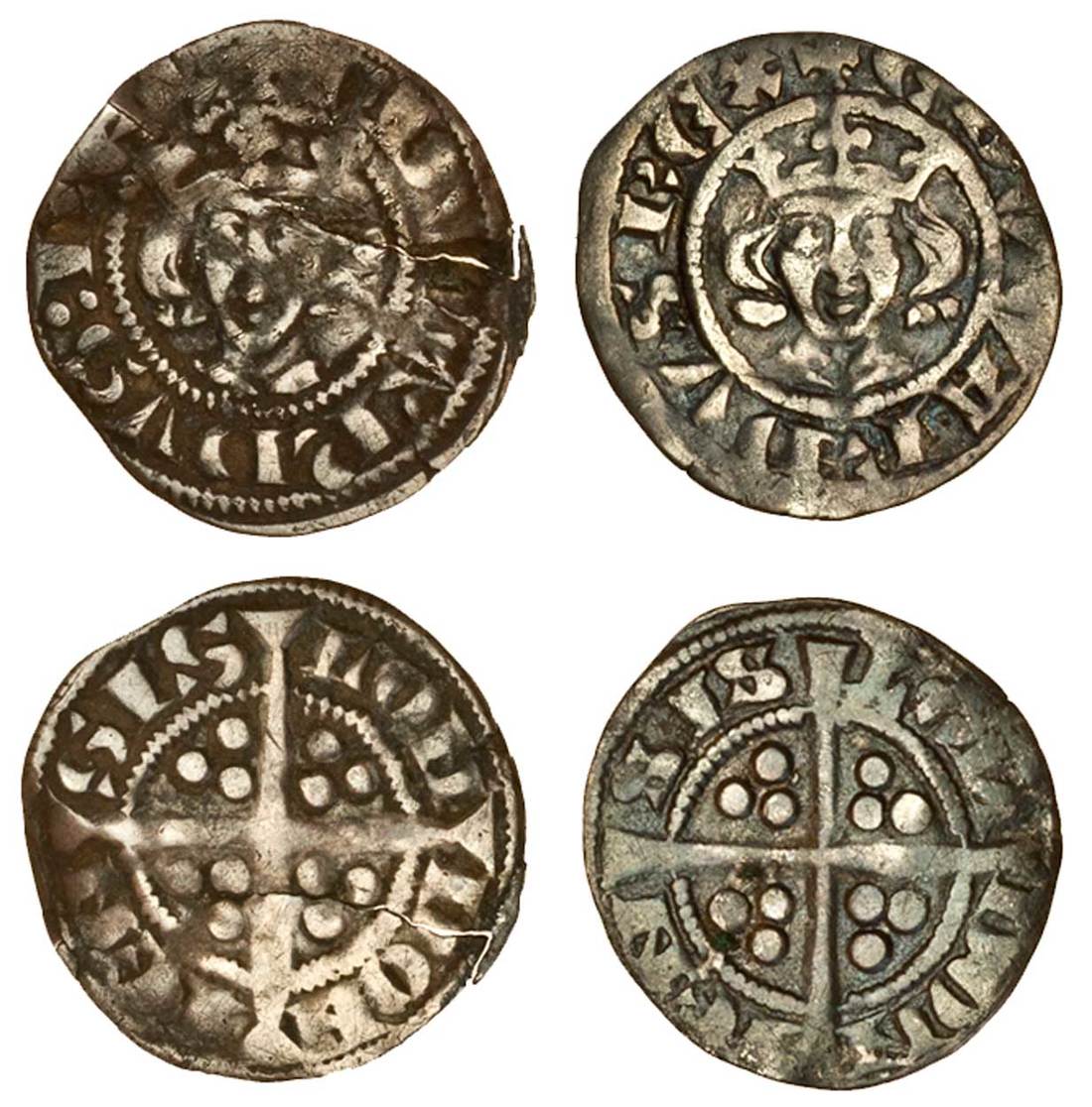 Edward I (1279-1307), New Coinage, Farthings (2), London, Class 1a, base silver issue, 0.37g, obv.+edwardvs:rex, bifoliate crown without jewels, rev. lon don ien sis, long cross pattée, three pellets in each angle, cracked, fine, Class 1c, 0.38g, trifoliate crown, no colon in legend, rev. loи don ien sis, very fine ( (N.1051/1, N.1052; S.1443, S1443A; SCBI 39/1001 this coin; Stewartby p.178, Ia, Ic, the second pl7/155 this coin), both rare (2)