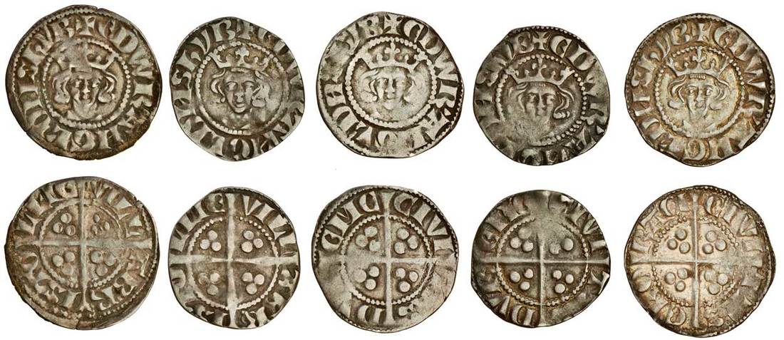 Edward I (1279-1307), Pennies (5), Class 2b, Bristol (2), 1.41g, rev. vill abr isto llie, good fine, 1.15g, almost fine, Durham (2), 1.27g, rev. civi tas dvr eme, nearly fine, 1.20g, almost fine, York, Royal Mint, 1.38g, rev. civi tas ebo raci, nearly very fine (N.1015; S.1416, S.1421, S.1429; Stewartby p.171, IIb), the second and fourth clipped, the two coins of Durham both have the inner pellets with a nick from a damaged punch (5)