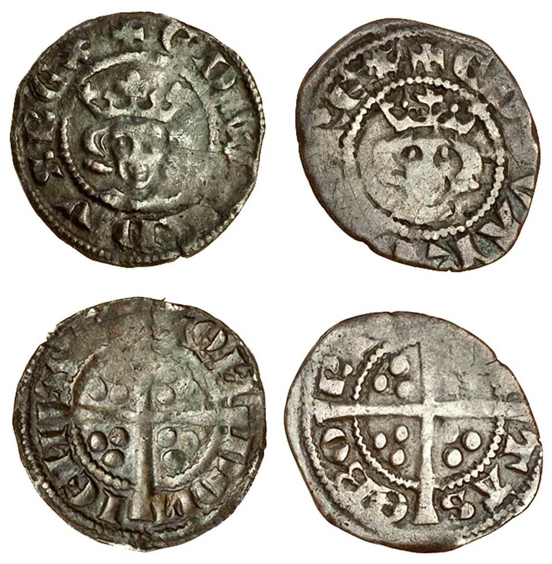 Edward I (1279-1307), Farthings (2), Class 2, fine silver issue, London, 0.44g, obv, no colon in legend, trifoliate crown with jewels, rev. loи doи ieи sis, long cross pattée, three pellets in each angle, about very fine, York, 0.46g, rev. [ ] tas ebo ra[ ], oval flan, flat in one part, very fine (N.1052; S.1444, S.1454; Stewartby p.178, Ic, the first, pl.7/156 this coin), both rare, the second more so (2)
