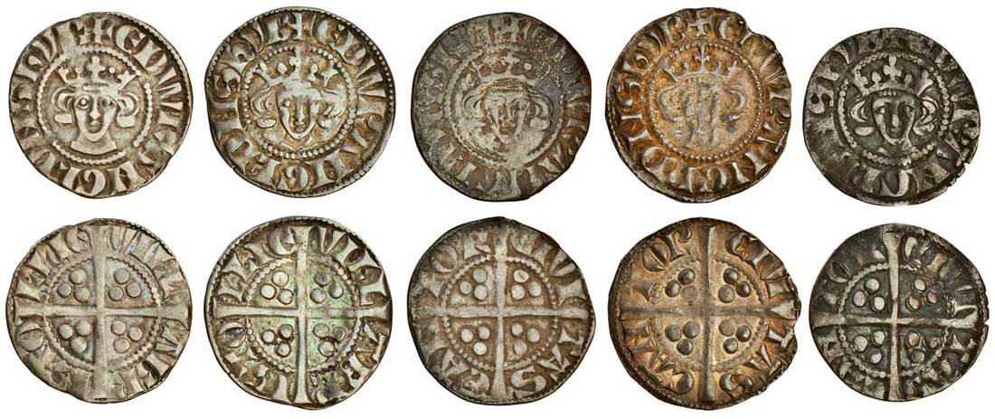 Edward I (1279-1307), Pennies (5), Bristol (2), Class 3b, 1.29g, rev. vill abr isto llie, good fine, Class 3c, rev. vill abr isto llie, 1.41g, creased, almost very fine Canterbury (3), Class 3b, 1.32g, rev. civi tas can tor, fine, Class 3c (2), rev. civi tas can tor, 1.48g, good fine, the reverse better, 1.13g, slight crease, good fine, (N.1017, N.1018; S.1416, S.1419; Stewartby p.171, IIIb, IIIc), the first rare (5)