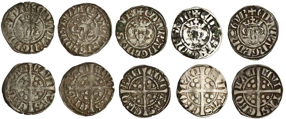 Edward I (1279-1307), Pennies (5), Class 3e, York Royal Mint, rev. civi tas ebo raci, 1.34g, nearly fine, 1.42g, nearly fine, 1.36g, variety with pellet-barred Ns on the obverse, obverse ghosting, otherwise almost very fine, Class 3e/f mule, 1.33g, variety with late style S on the reverse, nearly fine, the reverse fine, Class 3f/e mule, 1.39g, the obverse with Lombardic Ns, good fine (N1020, mules with N.1021; S.1429; Stewartby p.172, IIIe, IIIe/f, IIIf/e), the fourth and fifth both extremely rare (5)