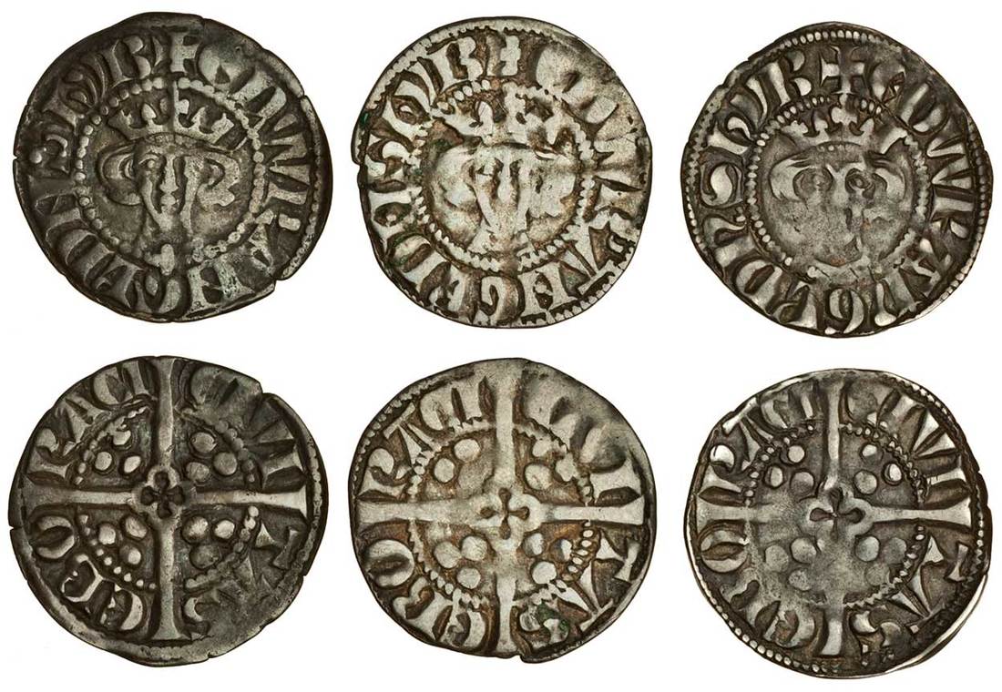 Edward I (1279-1307), Pennies (3), Class 3e, York Episcopal Mint, rev. civi tas ebo raci, quatrefoil in centre of reverse, 1.37g, variety with quatrefoil on breast, slight crease, nearly very fine, 1.32g, variety with pellet-barred Ns on the obverse, fine, Class 3f/e mule, 1.39g, the obverse with Lombardic Ns, soft areas, nearly very fine (N1020, N.1021/N.1020; S.1430; the third SCBI 39/154 this coin; Stewartby p.172, IIIe, IIIf/e), the third extremely rare (3)