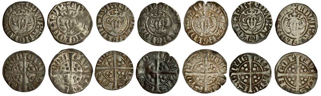 Edward I (1279-1307), Pennies (7), Class 3f, London (3), broad face, large nose, coarser work, wedge contraction marks, rev. civi tas lon don, 1.22g, crescent contraction marks, good fine,1.37g, damaged crown, lustre, fine, 1.03g, clipped, good fine, Canterbury, 1. 28g, rev. civi tas can tor, a small chip at 12 o’clock, fine, Bristol (2), 1.41g, rev. vill lbr isto llie, chipped at 12 o’clock, good fine, 1.26g, vill abr isto llie, dark tone, good fine or slightly better, Lincoln, 1.34g, rev. civi tas lin col’, edge crack, fair (N1021; S.1392, S.1419, S.1416, S.1427; the fourth, SCBI 39/149 this coin; Stewartby p.171, IIIf), scarce, the fourth and seventh rare, the fifth unusual with the mint error (7)