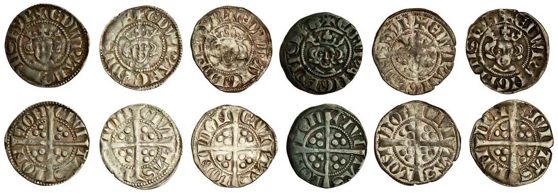 Edward I (1279-1307), Pennies (6), London, Class 4, Spread crown with large side fleurs, oval face with long hair, rev. civi tas lon don, 1.32g, Class 4aí2, tall narrow N, fine, 1.43g, Class 4aí3, very large S, a small weak area, otherwise almost very fine, 1.44g, Class 4aí4, taller crown and incurved letters, the obverse fine, the reverse better and very fine, 1.30g, Class 4b, smaller face and hair, a strong portrait,nearly very fine, 1.37g, Class 4c, more hair and a nick to crown band, nearly very fine, 1.37g, Class 4d, pellet at the beginning of the legend both sides, slightly ragged, good fine (N1023, N.1024, N.1025, N.1026; S.1394, S.1395, S.1396, S.1397; Stewartby p.172, IV early, IV late, the first pl.5/100 this coin), (6)