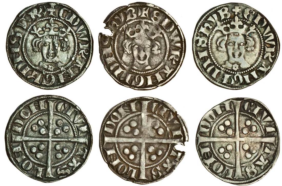 Edward I (1279-1307), Pennies (3), London, Class 7a, 1.33g, rose on breast, almond eyes, double barred Ns, obverse legend reads dns yb, rev. civi tas lon don, some encrustation in the devices, but an excellent portrait, better than very fine, 1.39g, variety with no rose on breast, edge loss from an attempted piercing, otherwise nearly very fine, 1.41g, a late obverse die with incurved letters, nearly very fine (N.1032; S.1403; Stewartby p.173, VIIa; the second BNJ 59 pl.6/8 this coin), the first and second extremely rare (3)