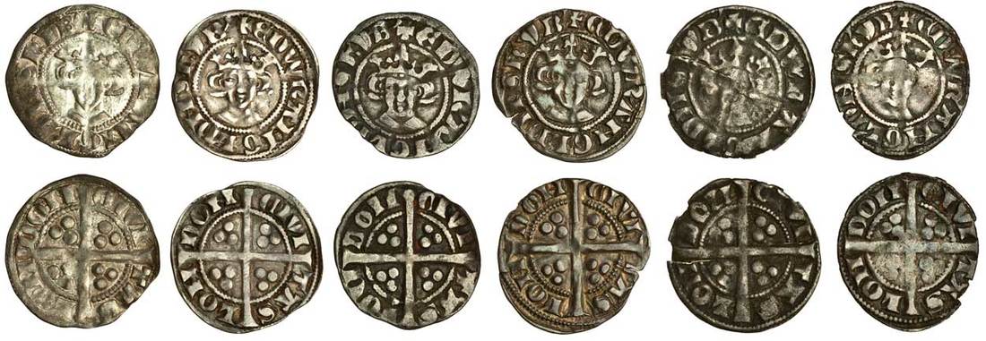 Edward I (1279-1307), Pennies (6), Class 8, London, Class 8a, 1.31g, crown with broken central lis, strong ghosting, nearly very fine, Class 8b (3), top tilted S and wider drapery, 1.40g, doubled barred N in angl, almost very fine, 1.31g, normal Ns, good fine, 1.39g, edge cracks, almost very fine, Class 8c (2), crown with very arched band, 1.08g, cracked with edge loss, fair, 1.22g, edge loss, otherwise fine (N.1034/1, N.1034/2, N.1035; S.1405, S.1406, S.1406A; the second, SCBI 39/331 this coin; Stewartby p.173, VIIIa, VIIIb, VIIIc), all scarce (6)
