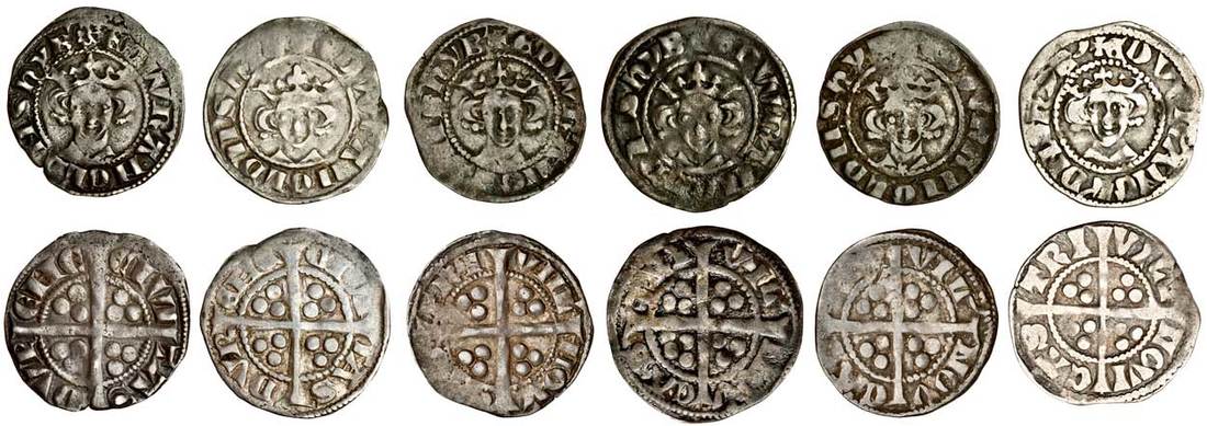 Edward I (1279-1307), Pennies (6), Durham (2), Class 9bí1, 1.40g, local reverse die, i.m. Cross Moline obverse only, rev. civi tas dvr ene, a small edge crack at 8 o’clock, otherwise nearly very fine, Class 9bí1/9c mule, 1.54g, i.m. Plain Cross, no star on breast, obv. unbarred pothook Ns, rev. double barred A and N, a decent portrait, good fine, Newcastle-upon-Tyne (4), Class 9bí1, 1.42g, unbarred pothook Ns, star on breast, rev. vill’ nov cas tri, barred Roman Ns, good fine ,Class 9c (2), 1.41g, obv. unbarred pothook Ns, no star on breast, rev. vil’ etc, barred Roman Ns, the reverse has been lacquered, otherwise fine, 1.38g, pothook Ns, star on breast, toned, good fine or better, Class 9c/10a mule, 1.40g, obv. anomalous bust, no star on breast, barred A, rev. vill’ novi cas tri, good fine (N.1037/1, N.1037/2; S.1423, S.1421, S.1428; the second, SCBI 39/462 this coin; Stewartby p.174, IXb1, IXb1/c, IXc, IXc/X), the first very rare, the second rare, the sixth extremely rare (6)