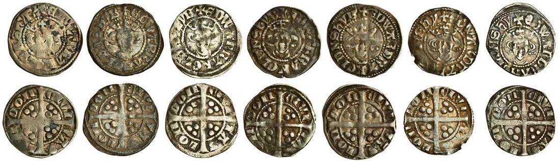 Edward I (1279-1307), Pennies (7), London, Phase 1, Class 10abí1/9b (2), 1.38g, obv. +edwarrangldnshyb’, trifoliate crown, barred Roman Ns, rev. civi tas lon don, unbarred pothook Ns, the portrait flat, fine, 1.44g, trifoliate crown, no end apostrophe, a bold fine, Class 10abí1 (2), 1.25g, bifoliate crown, legend ends with apostrophe, a wavy flan, almost fine, 1.41g, bifoliate crown, no end apostrophe, good fine, Phase 2, Class 10abí2 (3), +edwardrangldnshyb’, 1.35g, obv. small letters, bifoliate crown, barred Roman Ns, rev. civi tas loii doii, unbarred pothook Ns, good fine and better, 1.40g, legend ends dnshy, large letters, barred Roman Ns, rev. unbarred pothook Ns, a nick at 8 o’clock, good fine, 1.38g, legend ends dnshy, the h with a long serif from the top to right, nearly very fine (N.1039/1, N.1038/1; S.1409B, S.1409; Stewartby p.174, XP1a, XP1b, XP2, the last pl.5, 119 this coin), the first two very rare, the second two rare (7)