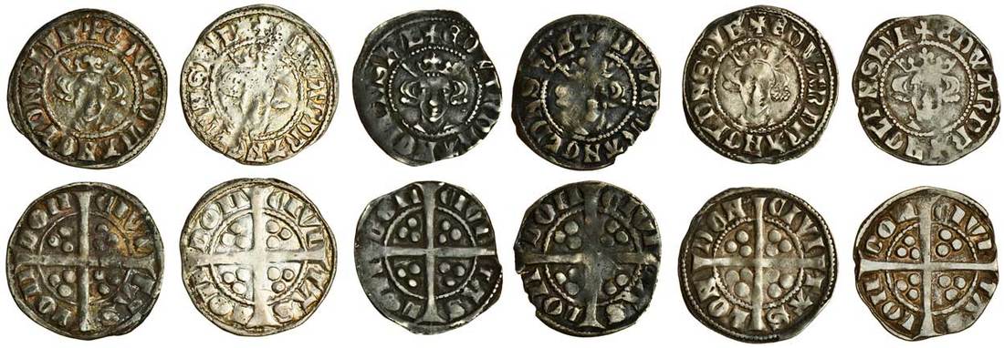 Edward I (1279-1307), Pennies (6), London, Phase 3, Class 10abí3a (3), 1.36g, obv. +edwardrangl’dnshyb’, small lettering, bifoliate crown, barred Roman Ns, rev. civi tas loii doii, unbarred pothook Ns, toned with scratches to the reverse, nearly very fine, 1.33g, bifoliate crown, annulet on breast, a weak portrait, the reverse considerably better, fine/very fine, 1.40g, bifoliate crown, legend ends no apostrophe, darkly toned, very fine, Class 10abí3b, 1.22g, taller crown, end apostrophe, barred Roman Ns, rev. unbarred Roman Ns, slightly ragged, fine, 1.41g, bifoliate crown, barred Roman Ns, rev. civi tas lon don, barred Roman Ns, the obverse double struck, otherwise good fine, the reverse better, 1.39g, no final apostrophe, barred Roman Ns, rev. unbarred pothook Ns, toned, fine (N.1038/2; S.1409, S.1409A; Stewartby p.174, XP3a, XP3b), the second extremely rare (6)