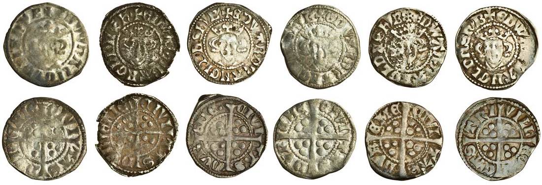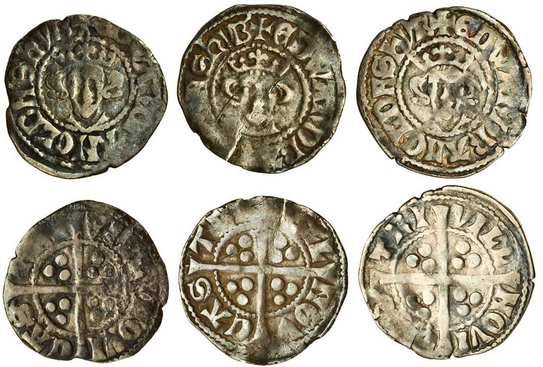 Edward I (1279-1307), Pennies (9), Durham (4), Phase 1, Class 9bí1/10abí2 mule, 1.34g, obv. i.m Plain Cross, unbarred pothook ns, rev. civi tas dvr ehie, weakly struck with lustre, near fine, Class 10abí2, 1.22g, bifoliate crown, legend ends h’, small letters, rev. large letters, porous, nearly fine, Class 10ab3/9c mule, 1.42g, bifoliate crown, end apostrophe, small letters, rev. double barred a and n, nearly very fine, Class 10abí3a, 1.42g, legend ends dnshyb’, top tilted S, bifoliate crown, barred Roman Ns, rev. civi tas dvr ehe, fine, Class 10ab5, i.m. Cross Moline obverse only, +edwarrangldnshyb, barred Roman Ns, rev. civi tas dvr eme, the reverse double struck, near fine/fine, Newcastle (4), Phase 1, Class 10abí1, 1.38g, obv. +edwarrangldnshyb, trifoliate crown, barred Roman Ns, rev. vill novi cas tri, barred Roman N, a soft portrait with light scratches, otherwise good fine, Class 10abí2 (2), 1.27g, bifoliate crown, no apostrophe, small letters, rev. top tilted S, irregular, fine, 1.40g, legend with apostrophe, small split at 7 o’clock, reverse surface cracks, fine, Class 10ab2/10abí3 mule, +edwardrangl’dnshyb, 1.34g, obv. small letters, bifoliate crown, barred Roman Ns, rev. flat S, barred Roman N, fine or better (N.1037/1-N.1038/1, N.1038/1, N.1038/2-N.1037.2, N.1039/1, N.1039/3; S.1408/S.1409, S.1409, S.1409/S.1408A, S.1409B; the third SCBI 39/526, the fourth SCBI 39/485 these coins; Stewartby p.174, IXb1/XP2, XP1a, XP2, XP2/3, XP3b/IXc, XP3), the first has the V or DVR cut over another letter, very rare, the third is a rare mule, the fourth very rare (9)