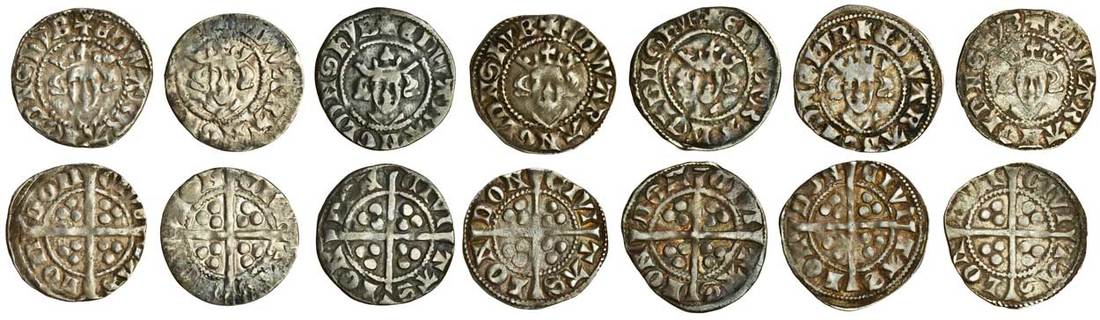 Edward I (1279-1307), Pennies (7), London, Phase S1a, Class 10cfí1/9b mule, 1.38g, obv. +edwarrangdnshyb, barred Roman Ns, rev. civi tas lon don, unbarred pothook Ns, good fine, Phase S1b, Class 10cfí1 (6), 1.20g, +edwarangldnshyb, crown 1 with axe-shaped central lis, wedge shaped petals, spearhead ornaments, struck off-centre, nearly very fine, 1.06g, obv. double barred n in dns, good fine, 1.44g, soft centres, strong legends, nearly very fine, 1.34g, obv. unbarred Ns, toned, good fine, 1.41g, barred Roman Ns both sides, nearly very fine, another, 1.45g, very fine (N.1040/N.1037/2, N.1040; S.1410/S.1408A, S.1410; Stewartby p.174, XS1a, XS1b), the first very rare (7)