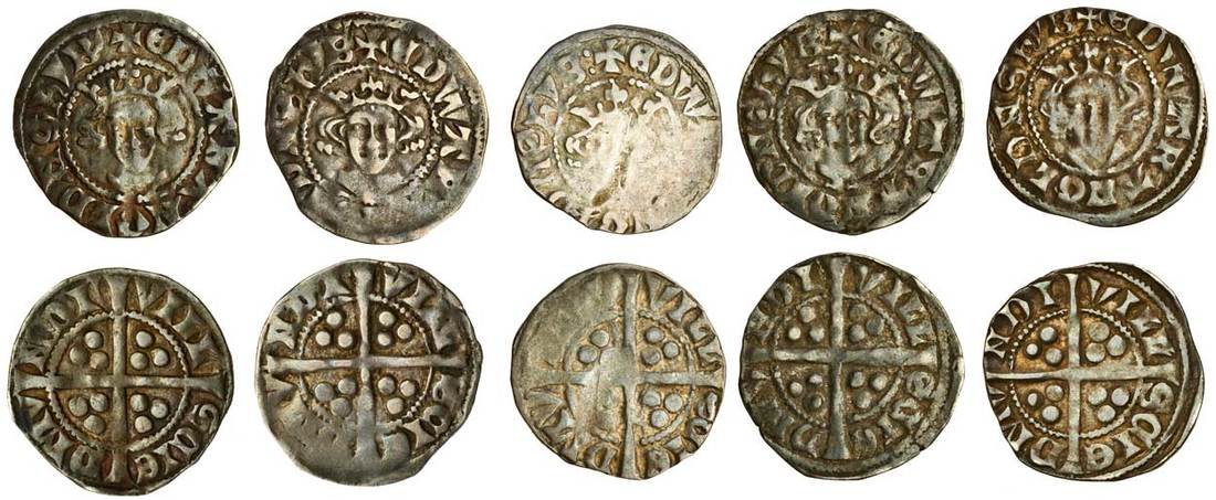 Edward I (1279-1307), Pennies (5), Bury St. Edmunds, Phase S1b, Class 10cfí1, 1.38g, obv. +edwarangldnshyb’, barred Roman Ns, rev. vill scie dmv ndi, barred Roman Ns, nearly very fine, Phase S2 (2), Class 10cfí2, crown 2 with well-shaped central lis, vestigial spearhead ornaments, bushy hair, 1.38g, weak below bust , otherwise good fine, Phase S3a, Class 10cfí3, 1.38g, obv. +edwarangldnshyb:, crown 3 with tall central lis, left spearhead leans right, broken e and h, rev. vill scie dmv ndv, weak in parts, otherwise fine, Phase S3b, no terminal colon to legend, new letters, round backed e and h with turned up tail, long narrow face with hollowed drapery and neck depression, 1.44g, the obverse letters differing in size, softly struck, good fine, 1.44g, pleasantly toned, good fine (N.1040, N.1041, N.1042/1, N.1042/2; S.1418; the second SCBI 39/621, the third SCBI 39/652 this coin; Stewartby p.174, S1b, S2, S3a, S3b), the first rare, the third very rare (5)