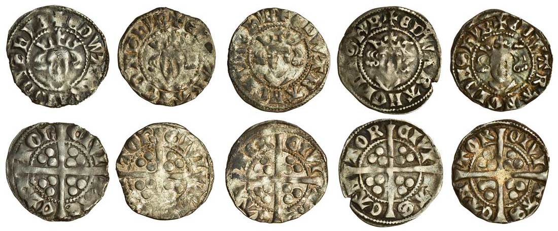 Edward I (1279-1307), Pennies (5), Canterbury, Phase 1a (2), Class 10cfí1, 1.40g, obv. +edwarrangdnshyb, barred Roman Ns, rev. civi tas can tor, barred Roman Ns, slight edge loss, a bold fine, 1.38g, +edwarangdnshyb, barred Roman Ns both sides, a weak portrait, fine or better, Phase 1b, 1.45g, +edwarangldnshyb, barred Roman Ns both sides, much lustre, good fine, Phase S2 (2), Class 10cfí2, +edwarangldnshyb, crown 2 with well-shaped central lis, vestigial spearhead ornaments, bushy hair, rev. civi tas can tor, barred Roman N, 1.36g, fine, another, 1.40g, a weak portrait, but otherwise a strong strike, attractively toned, very fine (N.1040, N.1041; S.1419; the first, SCBI 39/567 this coin; Stewartby p.174, XS1a, XS1b, XS2), the first and second very rare (5)