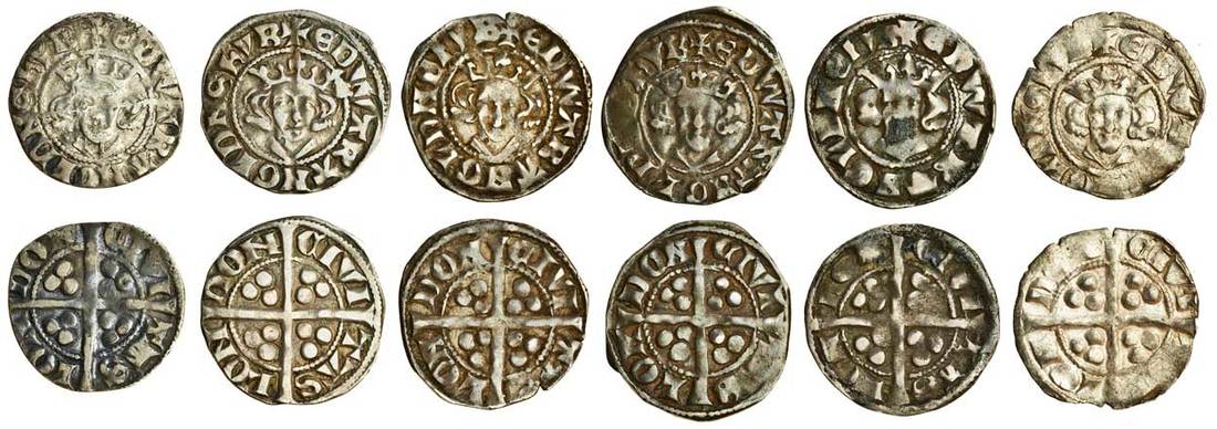 Edward I (1279-1307), Pennies (6), London, Phase S4, Class 10cfí4, 1.15g, obv. +edwarangldnshyb, crown 4 with hooked petal to right hand fleur, neat bust, rev. civi tas lon don, struck from a cracked obverse die, clipped, good fine, Phase S5, Class 10cfí5, 1.37g, obv. +edwarangldnshyb, crown 5,taller and more spread, right hand ornament inclines left, rev. civi tas lon don, well struck, very fine, 1.36g, different hair style, almost very fine, 1.42g, facial differences, good fine or slightly better, 1.32g, crown in later worn state, encrusted deposits, fine, Phase S6, 10cfí6, crown 3 with late lettering, flat in parts, otherwise nearly very fine with lustre (N.1042/3, N.1043/1, N.1043.2; S.1413, S.1414; Stewartby p.175, XS4, XS5, XS6; the second, BNJ vol.31 p.83 and pl.5/14 this coin), the first rare, the sixth very rare (6)