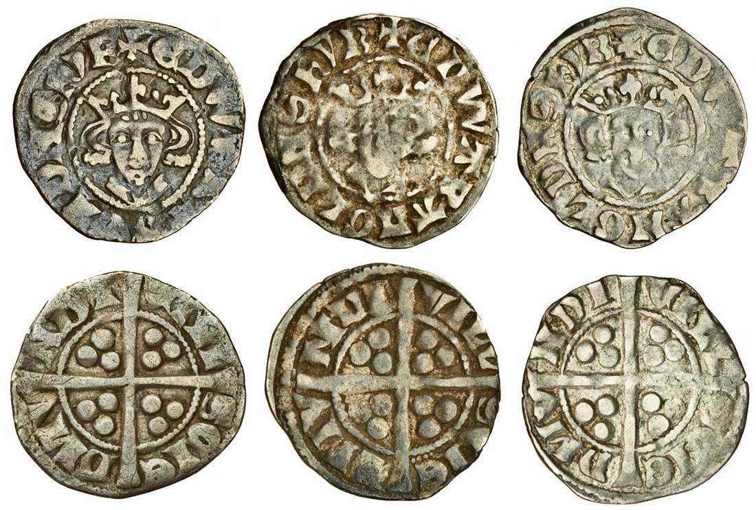 Edward I (1279-1307), Pennies (5), Bury St. Edmunds, Phase S4, Class 10cfí4, 1.32g, obv. +edwarangldnshyb, crown 4 with hooked petal to right hand fleur, neat bust, rev. vill scie dmv ndi, with vill cut over civi, a decent portrait,good fine, Phase S5, Class 10cfí5, 1.37g, obv. +edwarangldnshyb, crown 5, taller and more spread, right hand ornament inclines left, rev. civi tas lon don, a flat portrait, fine, 1.38g, late issue with repaired crown and sinister eye, almost very fine (N.1042/3, N.1043/1; S.1418; the first, SCBI 39/720 this coin; Stewartby p.175, XS4, XS5, the first, pl.6, 128, the second pl.6, 129 these coins), the first very rare, the second and third rare (5)