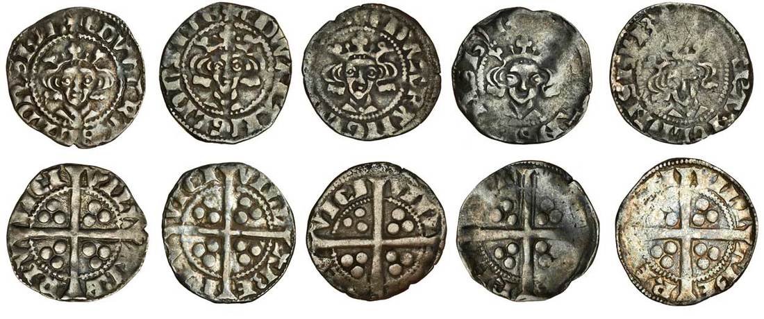 Edward I (1279-1307), Pennies (5), Berwick-on-Tweed, fine style, Type IVa, 1.29g, trifoliate crown, rev. vill abe rev vici, wide serifs, very fine, Type IVb (2), 1.23g, bifoliate crown, pellet on breast, eyes pellet between two semi-circles, good fine, 1.21g, fine, Type IVc (2), 1.44g, bifoliate crown, pellet-in-oval eyes, mostly flat, near fine, 1.33g, mostly flat, about fine (N.1078, N.1079, N.1080; S.1415; Stewartby p.180, IVa, IVb, IVc) (5)