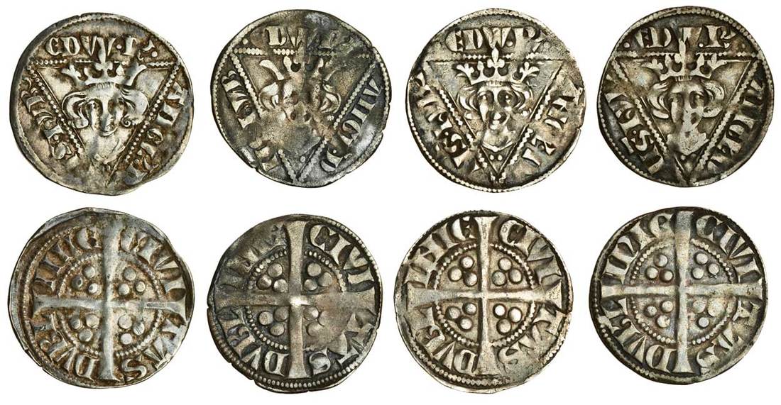 Ireland – Edward I (1272-1307), Pennies (4), First Phase, Second Coinage (1279-1302), Early Issues, Dublin, type 1a, 1.44g, edw•r’• /angl’•d/ ns• hyb’, crowned bust in triangle, trefoil of pellets below, barred a, rev. civi tas dvbl inie, Roman n, s waisted with two wedges, long cross pattée, three pellets in each angle, good fine, Type 1b (3), 1.32g, pellet before ed, unbarred a, rev. s with swollen centre, nearly fine/ fine, 1.33g, tall crown, nearly very fine, 1.36g, rev. Lombardic n, fine, the reverse better (S.6246A, S.6247; Stewartby p.182, IA/1, IA/2, IA/1, IA/3, the fourth, pl.8/193 this coin; the first BNJ vols. 61, pl.3/1 and 67, pl.1/1 this coin, the third BNJ vols. 61, pl.3/4 and 67, pl.1/3 this coin), the first and second very rare, the third and fourth extremely rare (4)