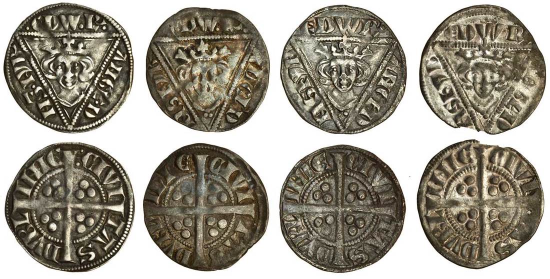 Ireland – Edward I (1272-1307), Pennies (4), Second Coinage (1279-1302), Dublin, type 1b (2), 1.40g, no trefoil below bust, rev. :civi, good fine, 1.33g, scrolled r on obverse, hollowed letters on the reverse, nearly fine, 1a (2), 1.34g, edwr’ /angl’d/ ns hyb, apostrophe punctuation only, rev. pellet barred n, scratch across the face and slightly porous surfaces, otherwise almost very fine, 1.31g, a small chip at 6 o’clock, otherwise much lustre and almost very fine