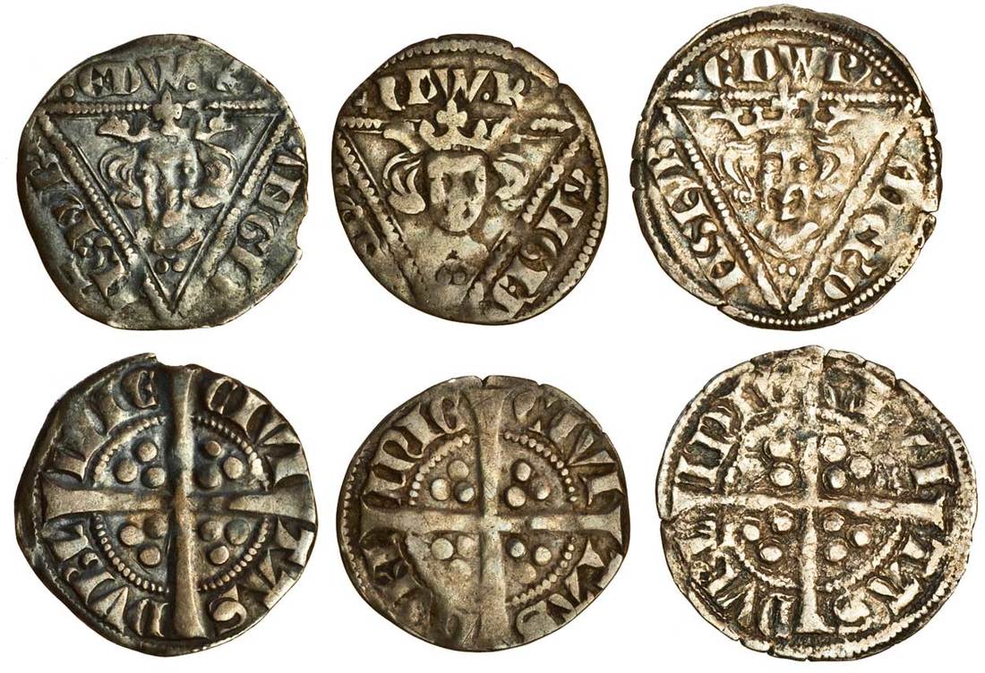 Ireland – Edward I (1272-1307), Pennies (3), Second Coinage (1279-1302), Dublin, Early Issues, type 1b, 1.38g, •edw•r’• /angl’•d/ ns• hyb’, crowned bust of type IIIg2 in triangle, trefoil of pellets below, unbarred a, rev. civi tas dvbl inie, Lombardic n, s with swollen centre, slight edge loss, fine, type 1c, 1.15g, +edw•r, Roman e, rev. Lombardic n, s with swollen centre, clipped, fine,Type 1b var, 1.32g, long gaunt face with hollowed eyes, wide hair, rough surfaces, good fine, (S.6247, S.6248, S.6247 var; Stewartby p.182, IB/3, IC/3, ID/3, the first, pl.8/195 and third, pl.8/197 these coins), the first rare, the last extremely rare (3)