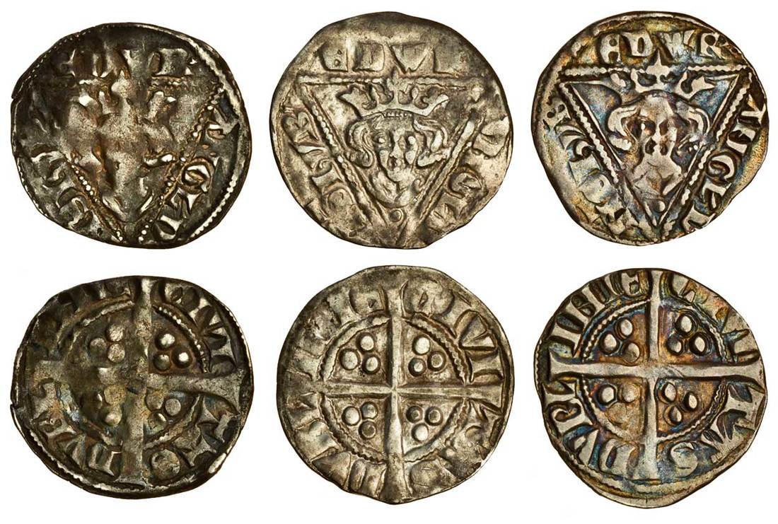 Ireland – Edward I (1272-1307), Pennies (3), Late Issues, Second Coinage (1279-1302), Dublin, type IVc, 1.30g, edwr’/angl’d/nshyb, pellet below bust, crown with tall central fleur, rev. civi tas dvbl inie, smaller lettering, strong legend but a flat portrait, about fine, Type IVa (4), 1.40g, hyb’, rev. larger letters, closed c, almost very fine, 1.31g, toned, good fine, 1. 41g, •edw, nearly very fine, 1.44g, edwr’, no pellet below bust, rev. large letters, good fine (S.6266, S.6264; Stewartby p.182, IVa, IVb), the first rare (3)