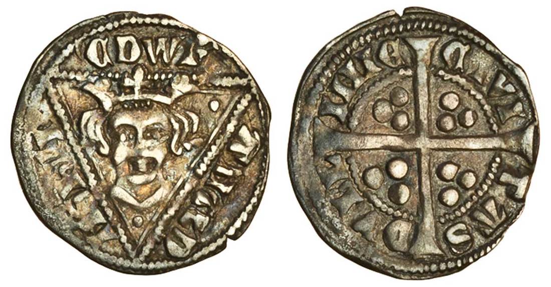 Ireland – Edward I (1272-1307), Halfpenny, Second Phase, Second Coinage (1279-1302), Dublin, type III, 0.68g, cdwr’ /angl’d/ ns hyb’, crowned bust in triangle, pellet below, wire-line hair, very fine (S.6261A; Stewartby p.183, III, pl.8/203 this coin), very rare