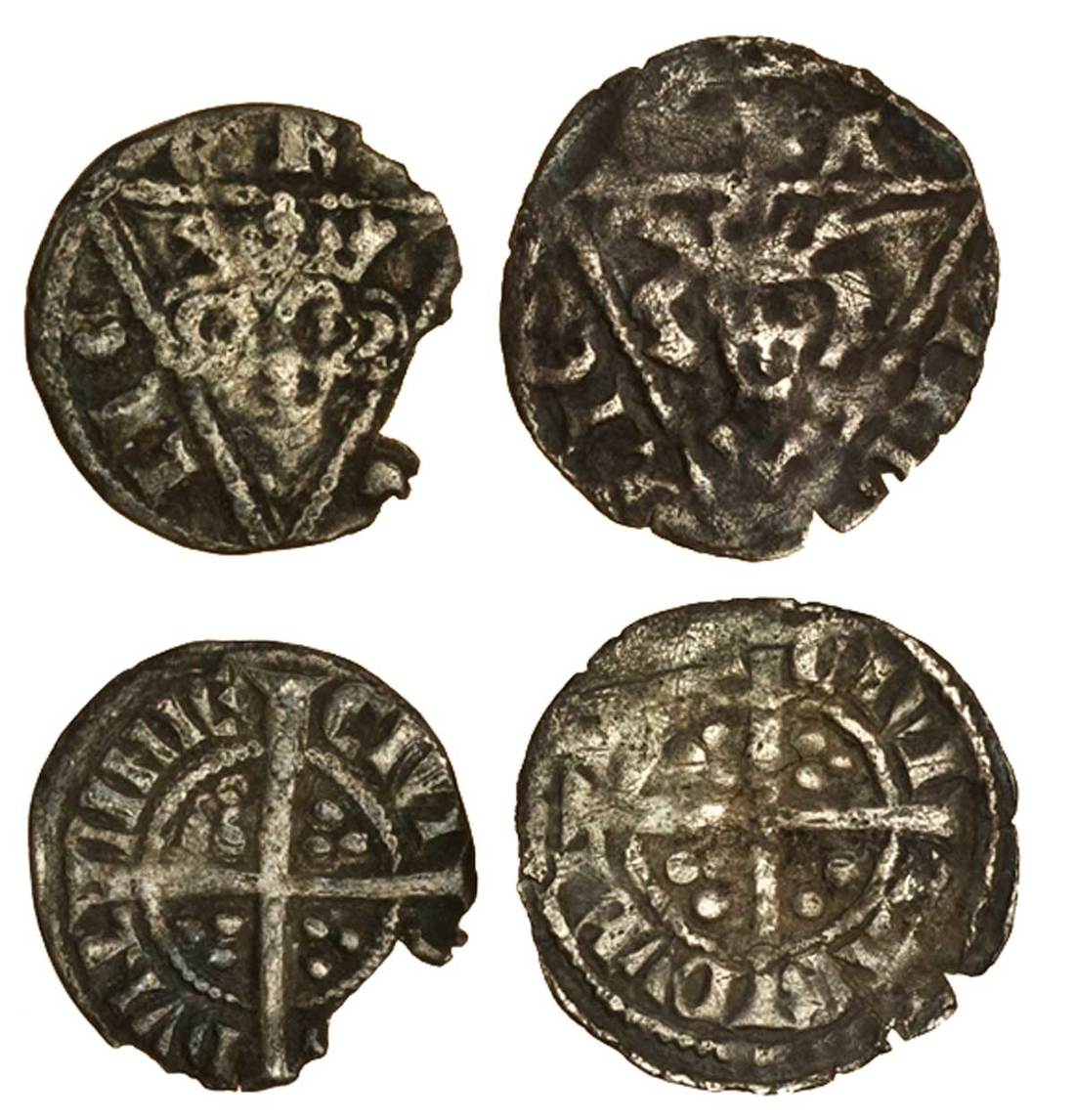 Ireland – Edward I (1272-1307), Farthings (2), First Phase, Second Coinage (1279-1302), Dublin, type I, 0.30g, era /ng/lie, tall trifoliate crown, bushy hair, pellet eyes, no neck, rev. civi t[ ] dvbl iinie, chipped with porous surfaces, fine, Third Phase, type IV, pellet below bust, wide crown, pointed drapery, rev. closed c and e, porous, fine (S.6255, S.6268; Stewartby p.183, I, IV, the second, pl.8/207 this coin), the first rare, the second very rare (2)