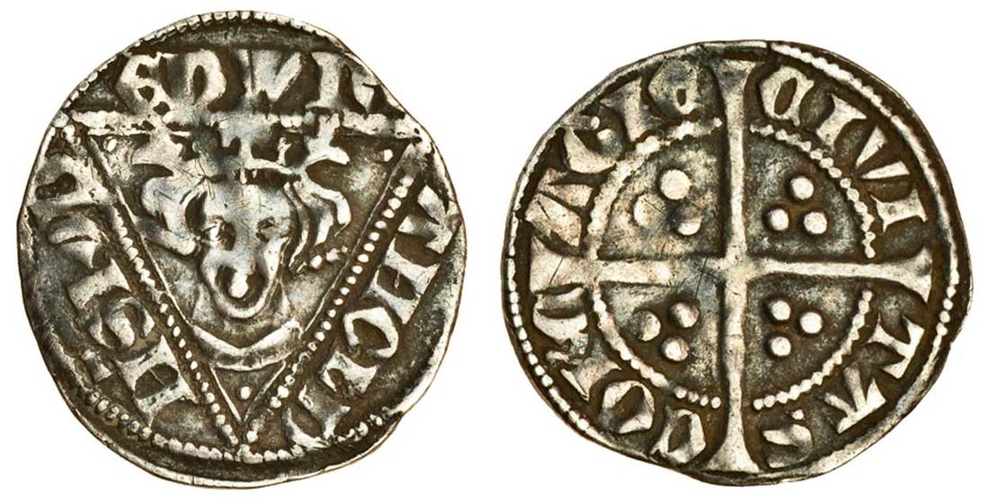 Ireland – Edward I (1272-1307), Penny, Second Phase, Second Coinage (1279-1302), Cork, type III, 1.40g, edwr /angld/ иshyb, crowned bust in triangle, pellet in each angle, crude lettering, rev. civi tas corg agie, good fine or better (S.6259; Stewartby p.182, III, pl.8/198 this coin), very rare.