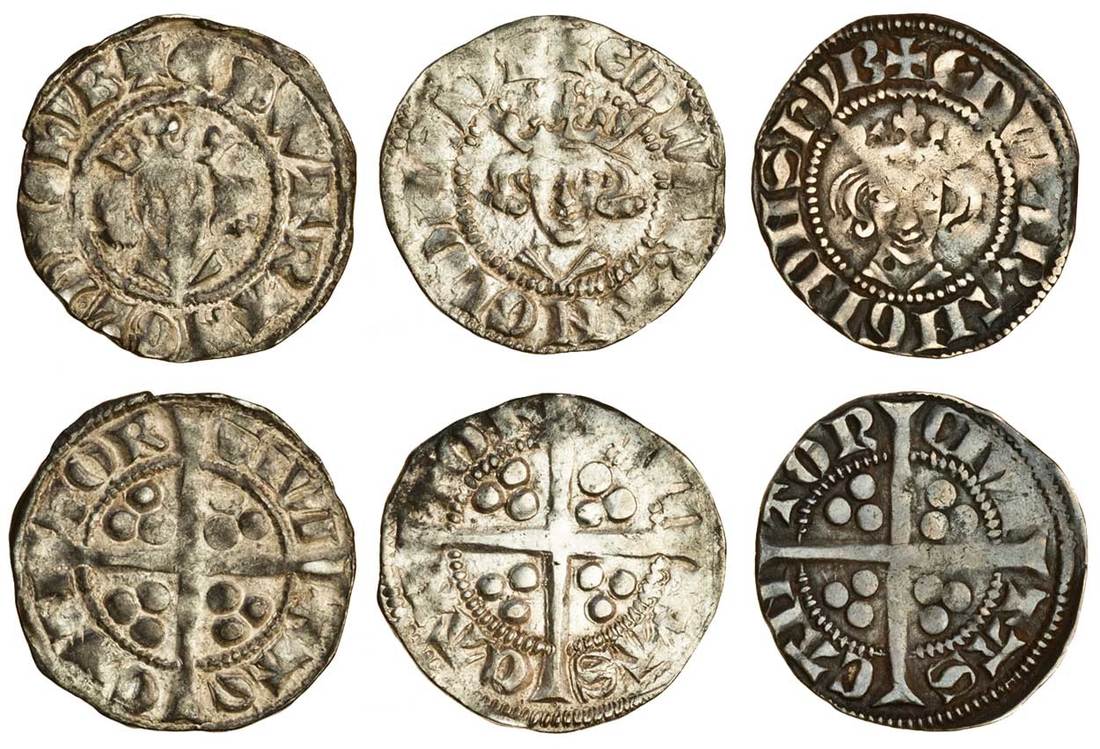 Edward II (1307-1327), Pennies (3), Canterbury, Class 10cfí6/11aí1 mule, 1.43g, obv. +edwarangldnshyb, crown 3 with lettering of late 10cfí5, rev. civi tas can tor, reverse of 11aí1 with wide n and tilted s, blunt strike, nearly very fine, Class 11aí2, 1.42g, obv. the crown with damaged dexter jewel, small c and t in legend, the legend weak at one point, almost very fine, Class 11aí3, 1.27g, a with right limb upright, open c and e, toned, good fine (N.1043/2-N.1060/1, N.1060/2, N.1060/3; S.1419/S.1466, S.1466; Stewartby p.175, S6/XIa1, pl.6/130 this coin, XIa2, XIa3; the last SCBI 39/801 this coin), the first very rare, the third rare (3)