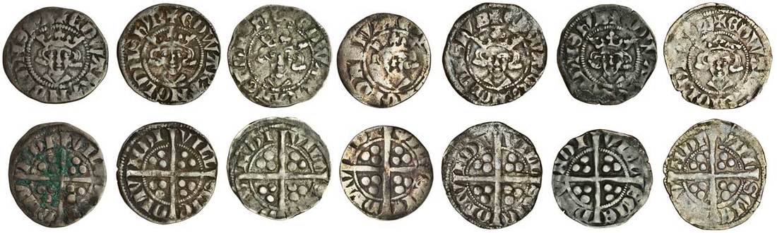 Edward II (1307-1327), Pennies (7), Bury St. Edmunds, Class 11aí3, 1.27g, obv. second a with right limb upright, open e, rev. vill scie dmv ndi, deposits on reverse, fine, Class 11bí1, 1.44g, a trace of the dexter jewel remaining, good fine, Class XIbí3, square n with wide serifs, good fine, Class 11c, 1.11g, clipped, fair, Class 12a, 1.29g, +edwarrangldnshyb, pellet ornaments, cracked, fine, Class 12b, 1.39g, diamond ornaments, good fine, Class 12c, 1.38g, i.m. Cross Pattée, heart shaped ornaments, is composed of wedges, peripheral weakness, fine or better (N.1060/3, N.1061/1, N.1061/3, N.1062/1, N.1063/1, N.1063/2, N.1063/3; S.1465; Stewartby p.175-6, XIa3, XIb1, XIb3, XIc, XIIa, XIIb, XIIc; the fifth SCBI 39/872, the seventh SCBI 39/877 these coins), the first three rare, the fourth and fifth very rare, the sixth and seventh extremely rare (7)