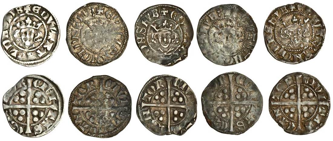 Edward II (1307-1327), Pennies (5), Canterbury, Class 10cfí5/11bí3 mule, 1.43g, obv. +edwarangldnshyb, small dumpy lettering, rev. civi tas can tor, reverse with square n and long serifs, irregular, nearly very fine, Class 11bí1, 1.40g, flat centres, fine, Class 11bí2/11bí1 mule, 1.34g, irregular, good fine, Class 11bí2, 1.28g, obv. legend ends hyb:, fair, Class 11bí3, 1.43g, obverse metal stress cracks, otherwise good fine, Class 12a, (N.1043/1-N.1061/3, N.1061/1, N.1061/2, N.1061/3; S.1419/S.1466, S.1466; Stewartby p.175, S5/XIb3, XIb1, XIb2/1, XIb2, XIb3; the first SCBI 39/858 this coin), North thought the first was possibly unique, extremely rare, the others rare (5)