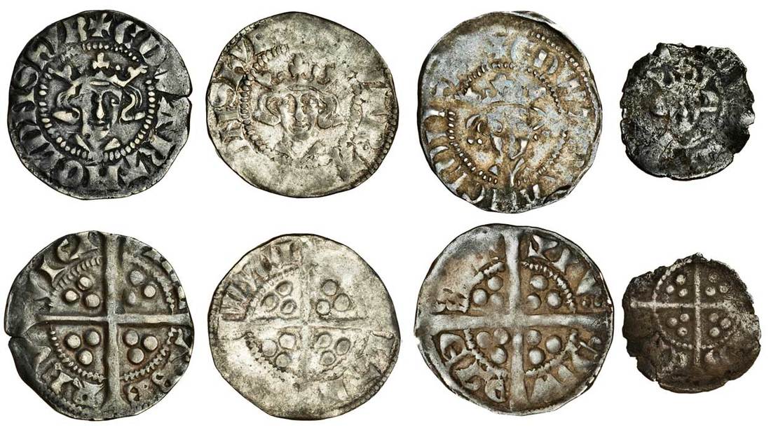 Edward II (1307-1327), Pennies (3), Berwick-on-Tweed, Class V/IV mule, 1.53g, +edwa r angl dns hyb, die of London XIaí3, bifoliate crown with dexter ornament broken, sinister a pellet, rev. vill abe rev ici, long cross pattée, three pellets in each angle, small edge split at 3 o’clock, toned, nearly very fine, Class V, 1.55g, additional pellet in the obverse legend after r, rev. :vil lab ere wici, flat in parts but a good portrait, this almost very fine, Class VI, local dies, 1.31g, refurbished coarse bust, rev. as previous, but retrograde, flat in parts, fine, Halfpenny, Class V, 0.53g, edwardvs[ ], rev. [ ]ab ere w[ ], ragged, poor to fair (N.1081/N.1078-80, N.1081, N.1082, N.1088; S.1464/S.1415, S.1464, S.1473; Stewartby p.180, V/IV, V, p.181, V), the first extremely rare, the second rare, the third and fourth very rare (4)
