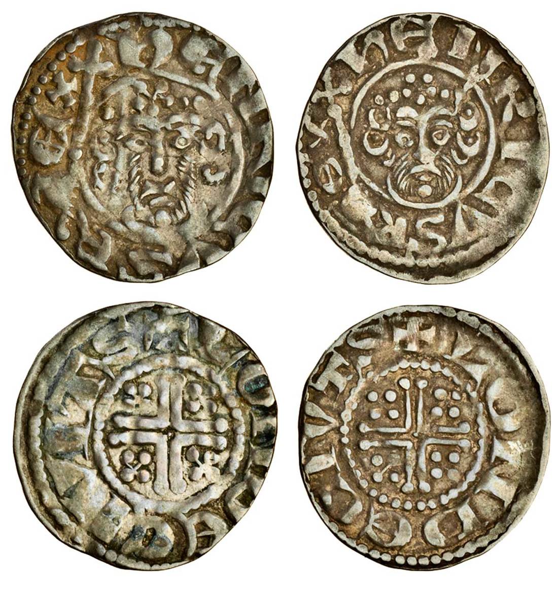 Short Cross, Sterling Pennies (2), Group CF, 1.36g, ‘London’ (2), henricvsr/ex, crude bust with thick lips, cinquefoil on crown , crudely cut pellets-curls 2/2, rev. +londecivits, i.m. cross pattée, the reverse struck off-centre, good fine (), 1.34g, bust based on class VII, s not reversed in obverse legend, normal sceptre head, rev. +londecivits, toned, nearly very fine (this coin SCBI 39/2207 same dies, Stewartby, NC 1995 p.248/86ii and p.248/90ii these coins), (2)