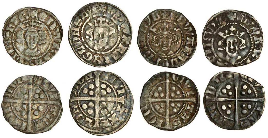 Long Cross, Sterlings (4), Edward I (1272-1307), ‘London’ Pennies (4), 0.92g, +edwrangldnshyb, facing bust, rev. civi tas loii doii, long cross, three pellets in each angle, good fine, 1.20g, +edwarrangldnshyb, facing bust, rev. civi tas lon don, fine, 1.32g, +edwarangldnshyb, facing bust, rev. civi tas loh doи, almost very fine, 1.20g, +edwart[ ]nshyb, facing bust, bifoliate crown, rev. civi tas loii don, clipped, good fine (Mayhew 375; Mayhew 377; Mayhew 378; Mayhew 397 & cf SNC May 1975, fig.7), (4)